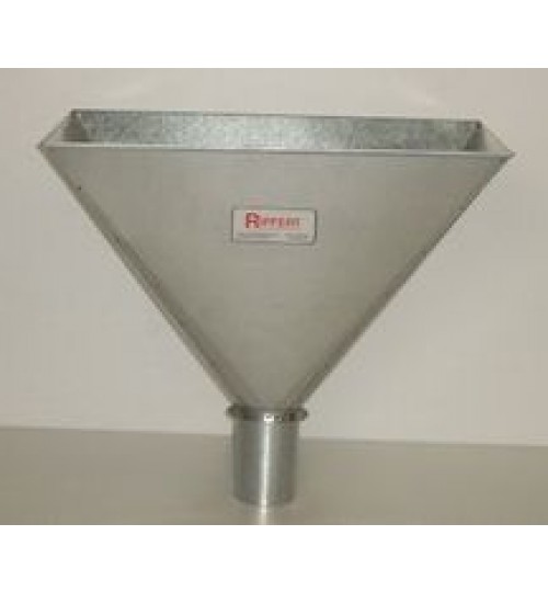 Verzinktes Stahlblech, dieser Trichter hat unten ein rundes Rohr 8 cm Ø. Die obere Öffnung hat die Maße: 55 x 32 cm. Gesamthöhe: 50 cm