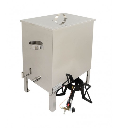 Material: Edelstahl, Gesamthöhe: 820 mm Aussenmaße: Länge 580 mm, Breite: 420 mm, Höhe: 610 mm, Korbmaße: Länge: 530 mm, Breite: 335 mm, Höhe: 440 mm, Ablaufhahn: 1“ Gratis: Hockerbrenner 8KW Propan - Butan