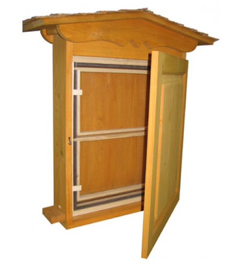 2-Waben Schaukasten: 1 x Jumbo, 1x Flachzargen Rähmchen übereinander, Fütterung von oben, durch exakten Beespace zu den Scheiben kein Wildbau, Silikondichtungen, daher kein Scheibenbruch, Fichte unbehandelt, ohne Glasscheiben