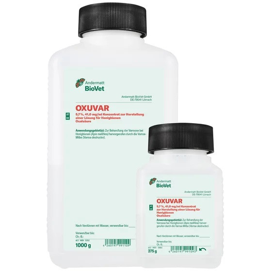 OXUVAR® 5,7% ist eine konzentrierte Lösung Behandlung der Varroose. Einfach in der Flasche mit Trinkwasser verdünnen. Die neu zubereitete Sprühlösung enthält jetzt 3,0% Oxalsäure-Dihydrat zum Besprühen von Schwärmen, Ablegern und brutfreien Wirtschaftsvölkern.