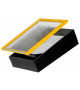 Bestehend aus einem schwarzem Holzkorpus mit Edelstahl-Innenwanne und gelbem Holzrahmen mit Doppelstegplatte