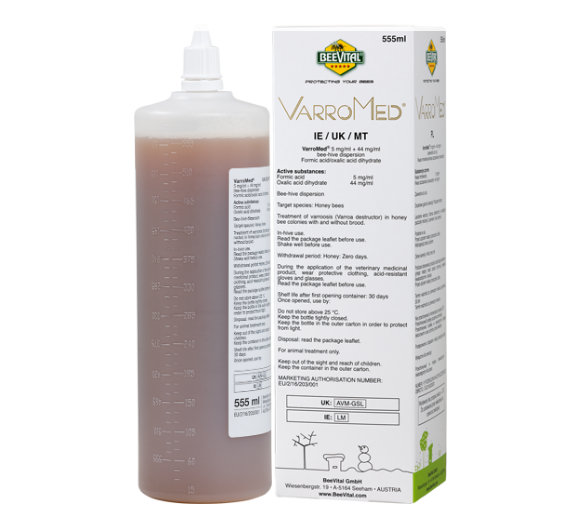 VarroMed ist das erste zugelassene Bienenarzneimittel für die gesamte EU. VarroMed wird in einer 555ml Flasche mit einem integrierten Tropfer und einer praktischen Skala zum einfachen Dosieren geliefert. VarroMed ist ein gebrauchsfertiges Produkt mit nur natürlichen Inhaltsstoffen und einer Kombination aus Ameisensäure und Oxalsäuredihydrat. Varromed hat 0 Tage Wartezeit und ist für die BIO-Imkerei zugelassen. VarroMed kann im Frühling, im Spätsommer/Herbst und im Winter angewendet werden. Das Mittel ist mit und ohne Brut anwendbar.